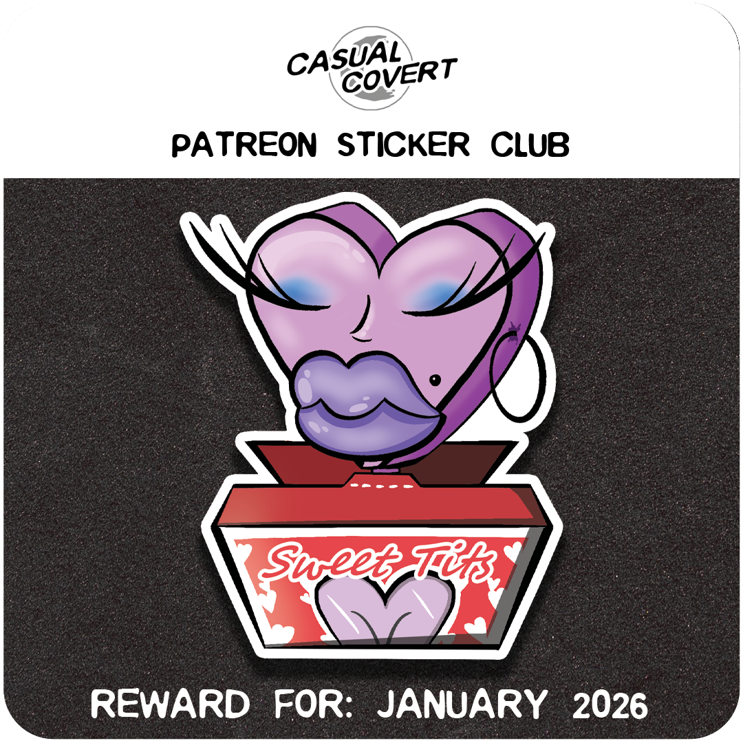 From now till January 31st, if you sign up for the Casual Covert Patreon Sticker Club, you’re gonna get the CRUNCHY and EXCLUSIVE Sweetie Staci sticker!
